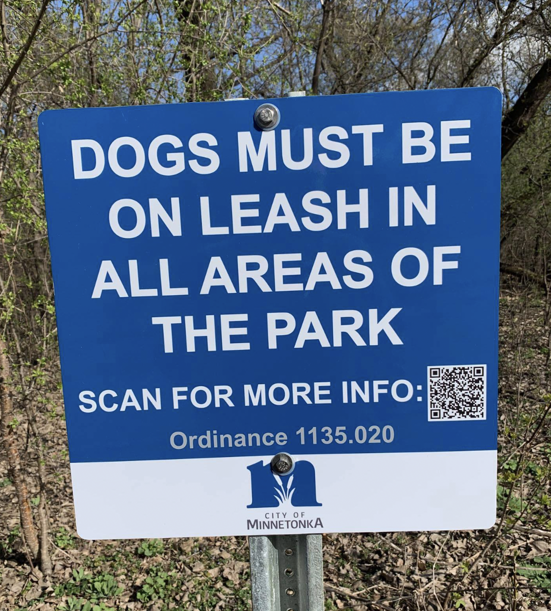New signs that prohibit off-leash dogs are appearing around Minnetonka Parks (Jidana, Covington Park, etc), as of April 2026.